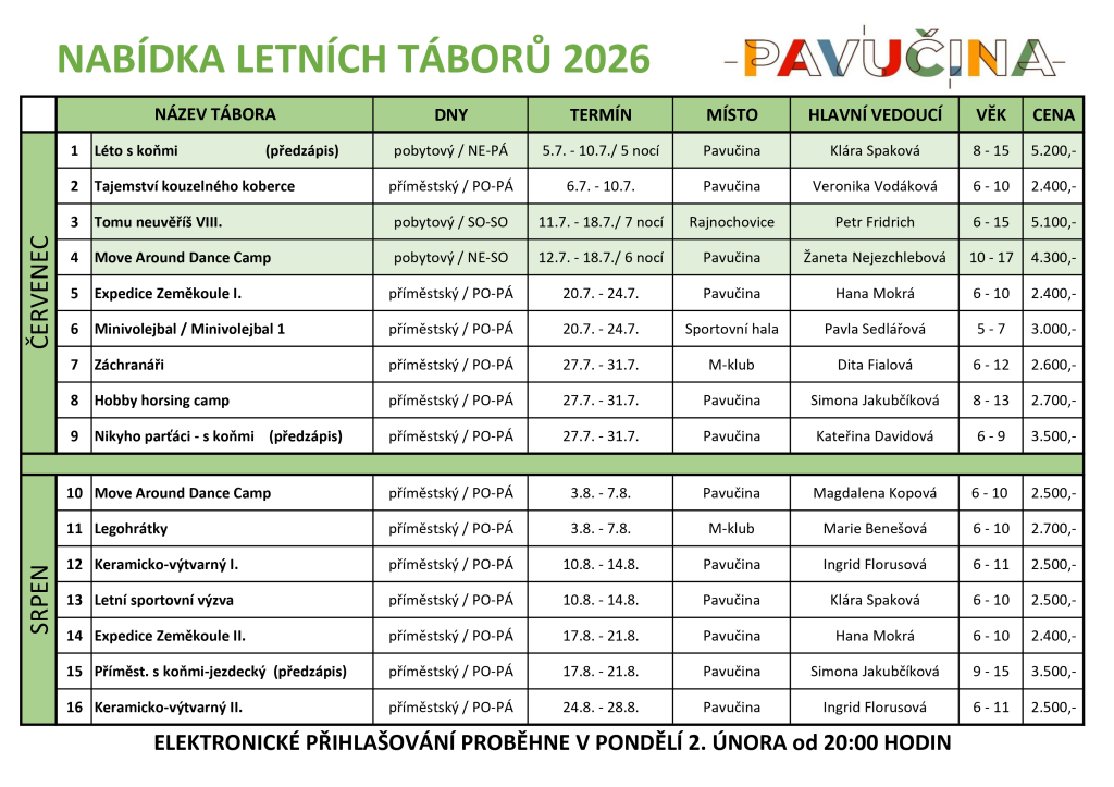 Elektronické přihlašování na letní tábory 2026 na stránkách Pavučiny.
